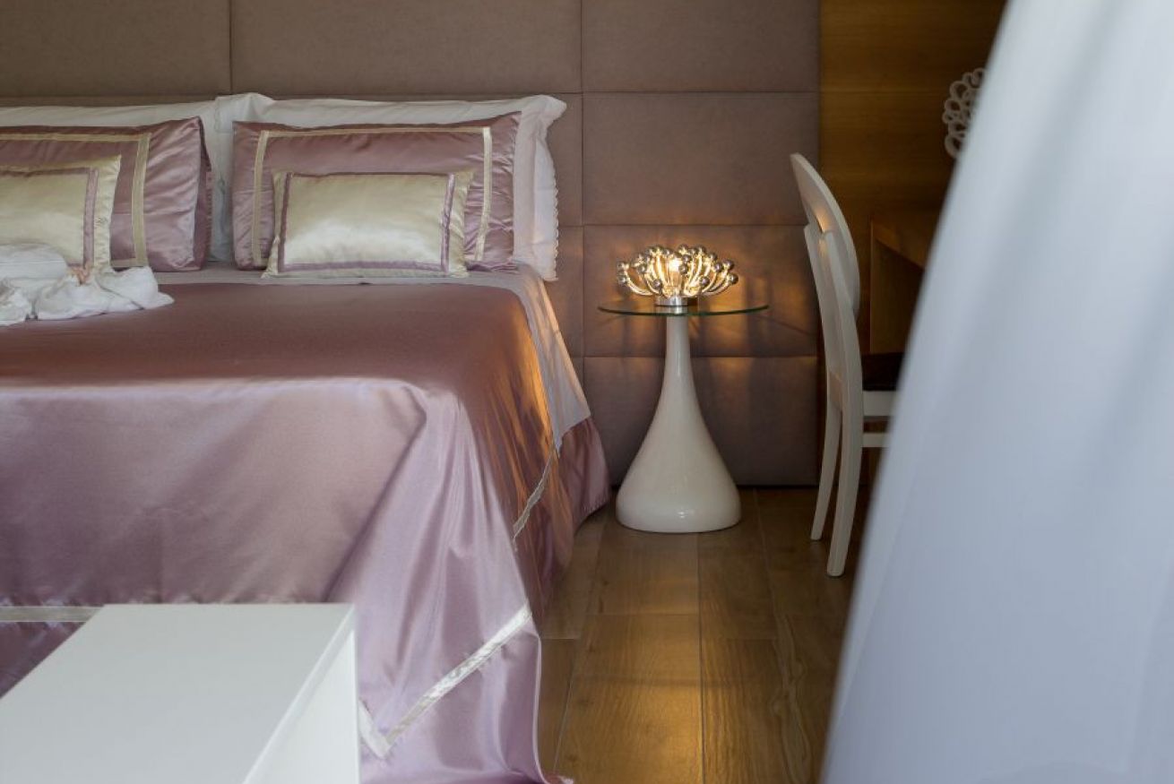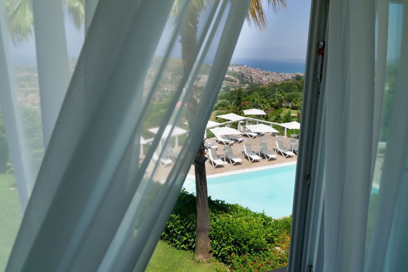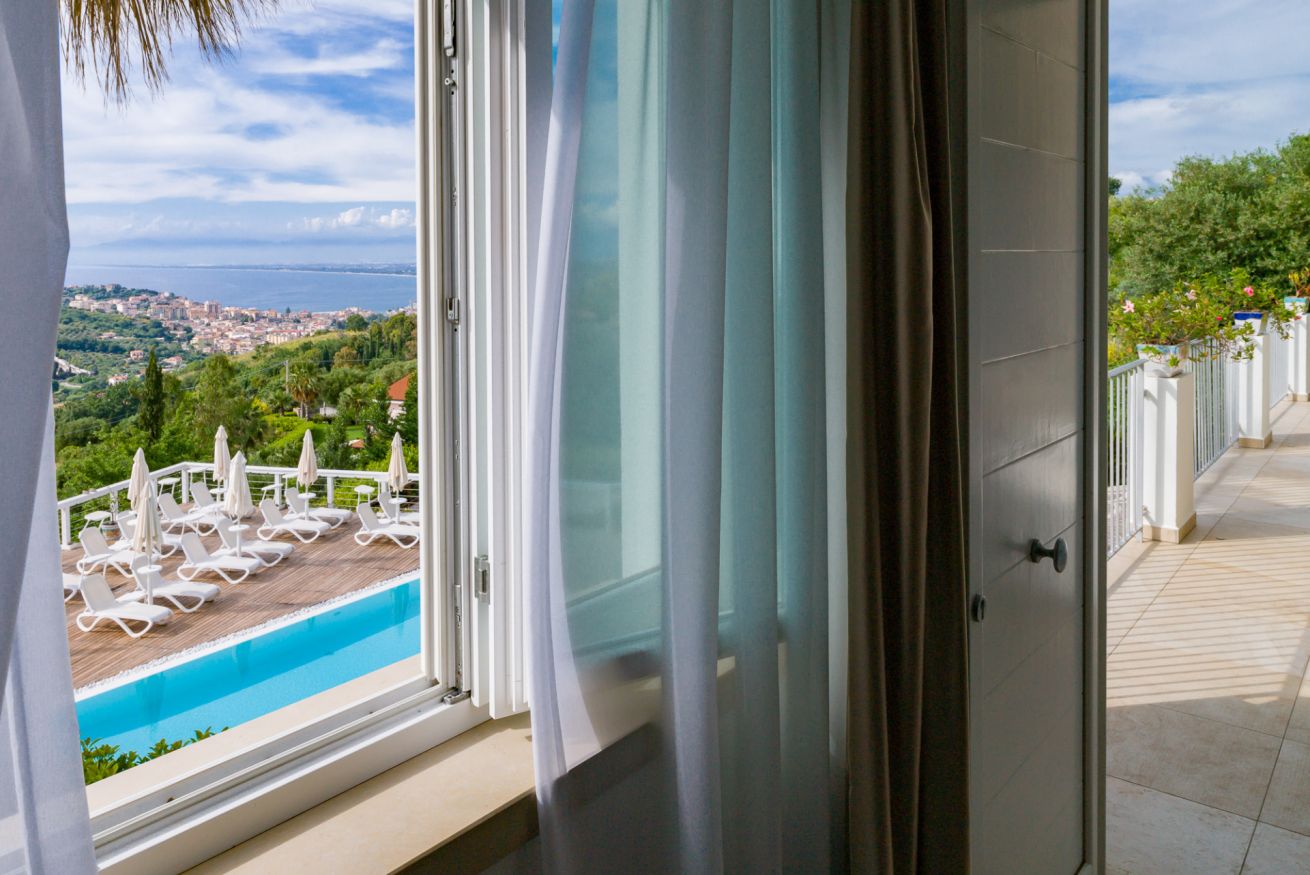 La camera è ubicata al 1°piano, misura 36 mq, è una doppia o matrimoniale con bagno privato e doccia. La camera può essere utilizzata come tripla con la configurazione matrimoniale più 1 letto singolo, oppure quadrupla con letto matrimoniale e 2 letti singoli e gode della vista mare, giardino e piscina.
