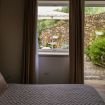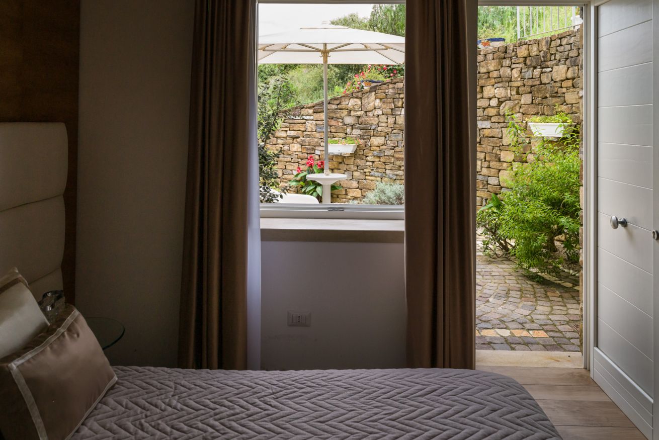 La camera è ubicata al piano terra o 1°piano, misura 19 mq, è una doppia o matrimoniale con bagno privato con doccia e vista giardino e spazio antistante la camera ad uso esclusivo arredato con poltroncine.