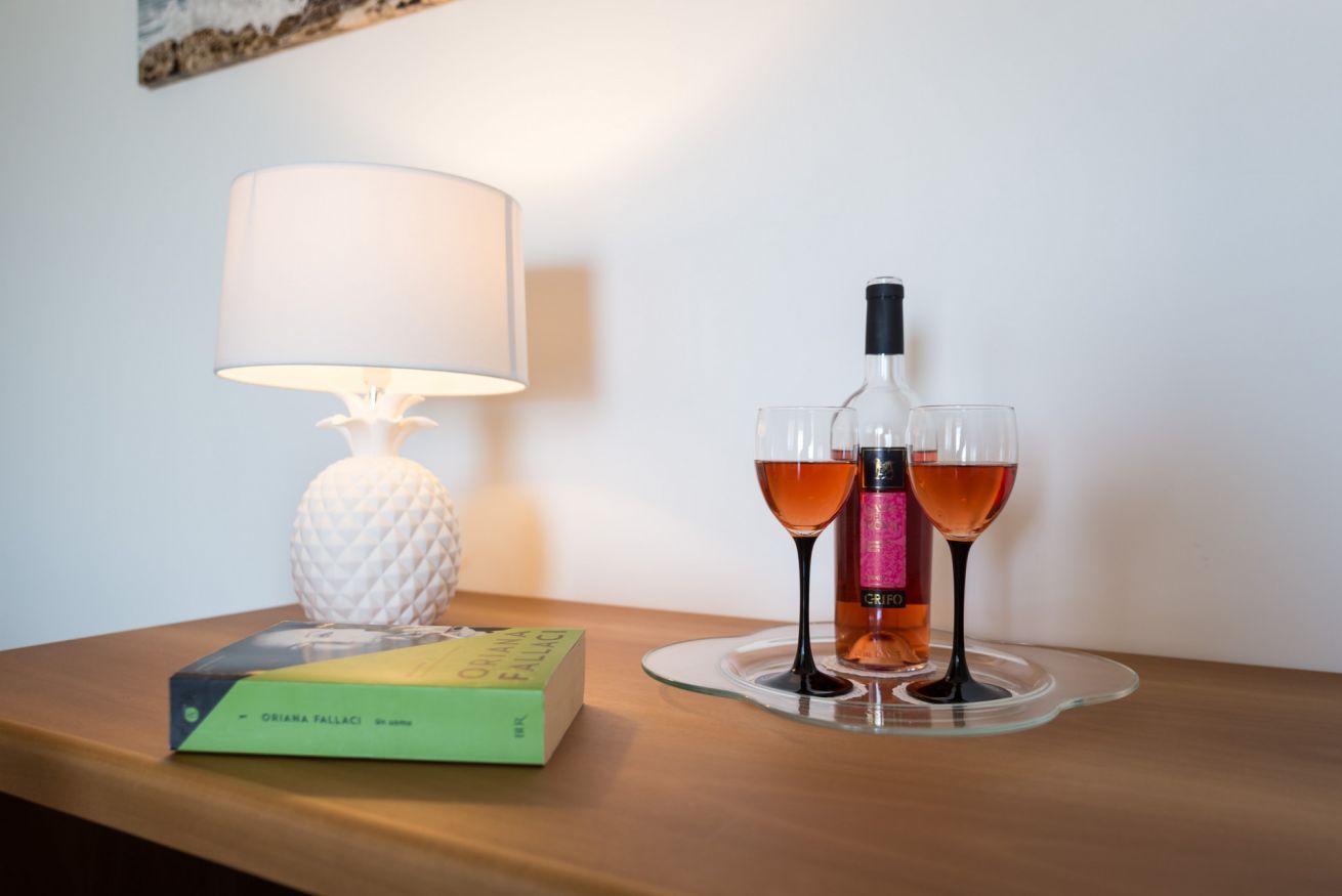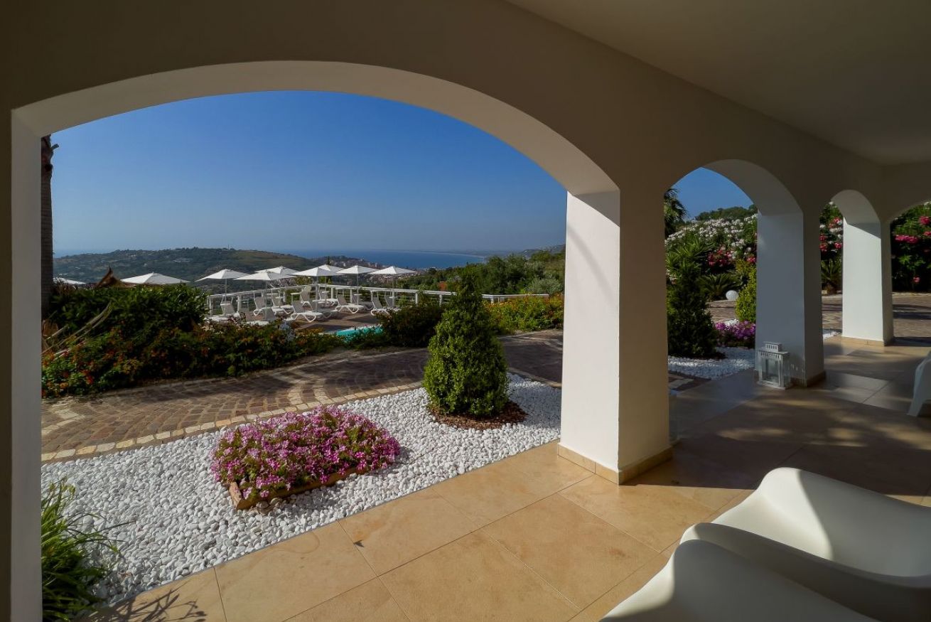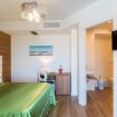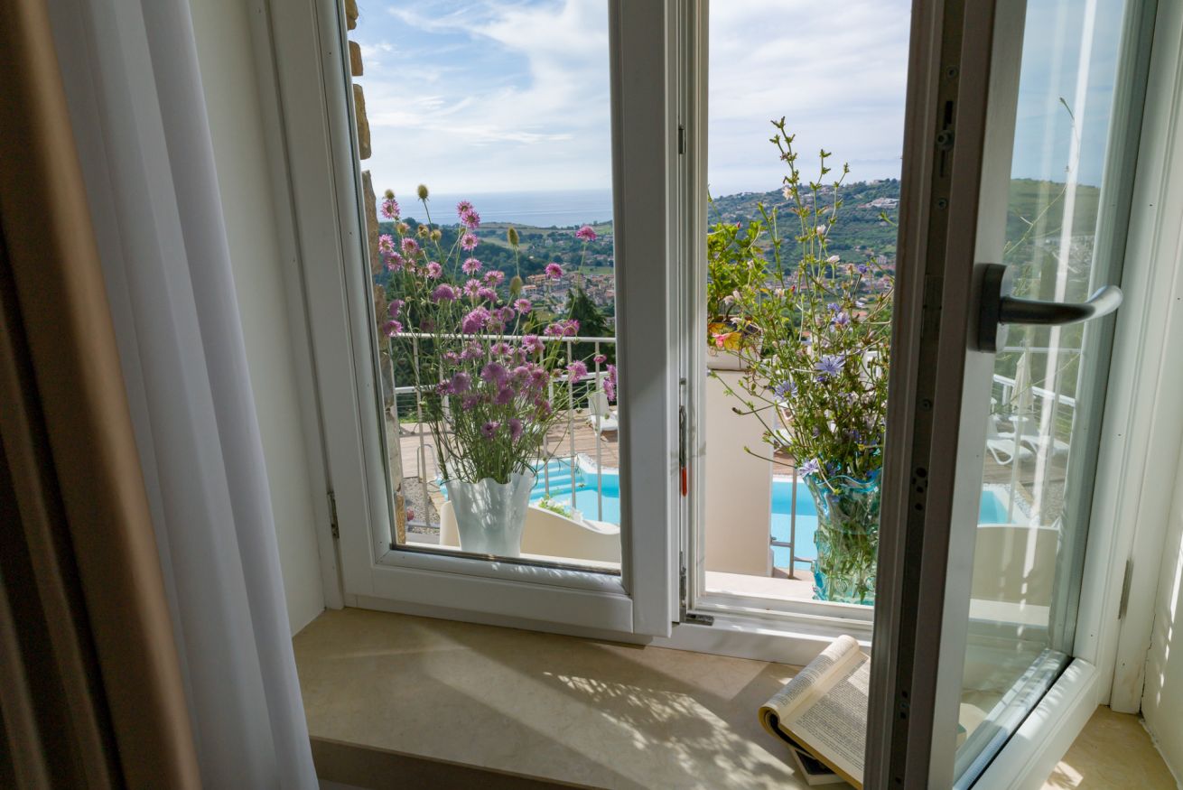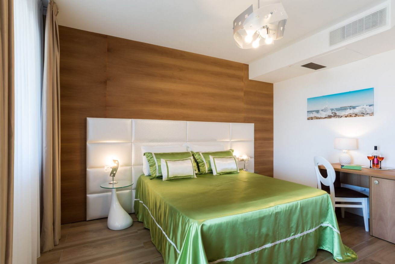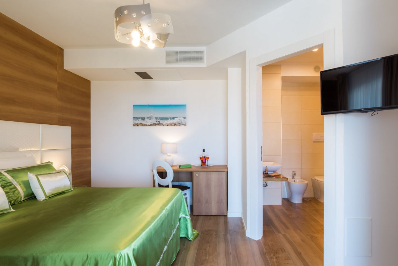 La camera è ubicata al piano terra o 1°piano, misura 19 mq, è una doppia o matrimoniale con vista mare, giardino e piscina.