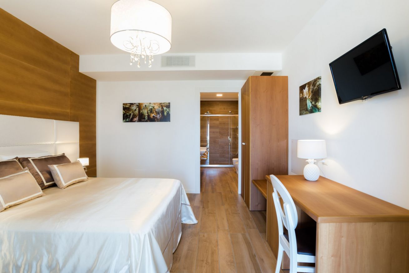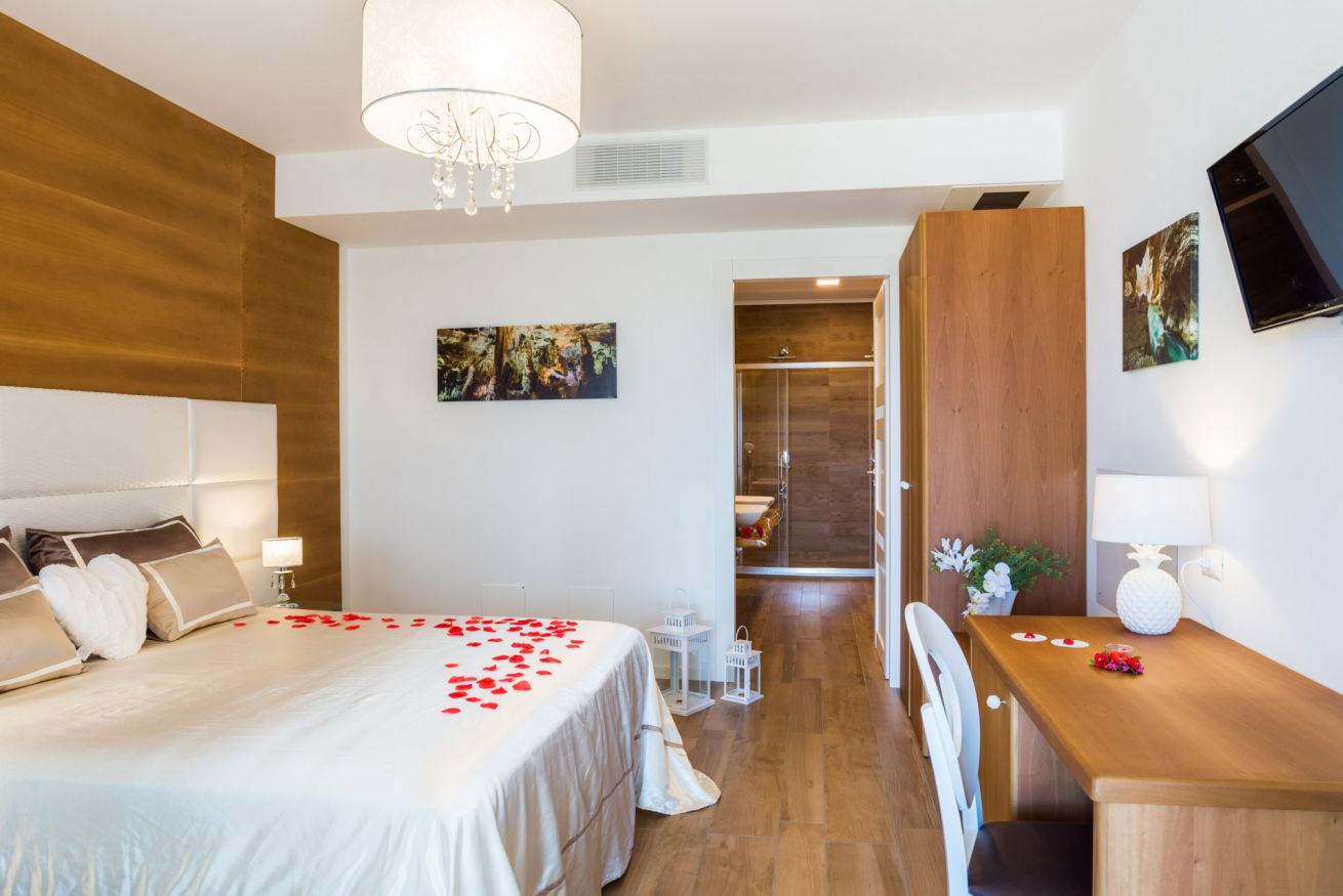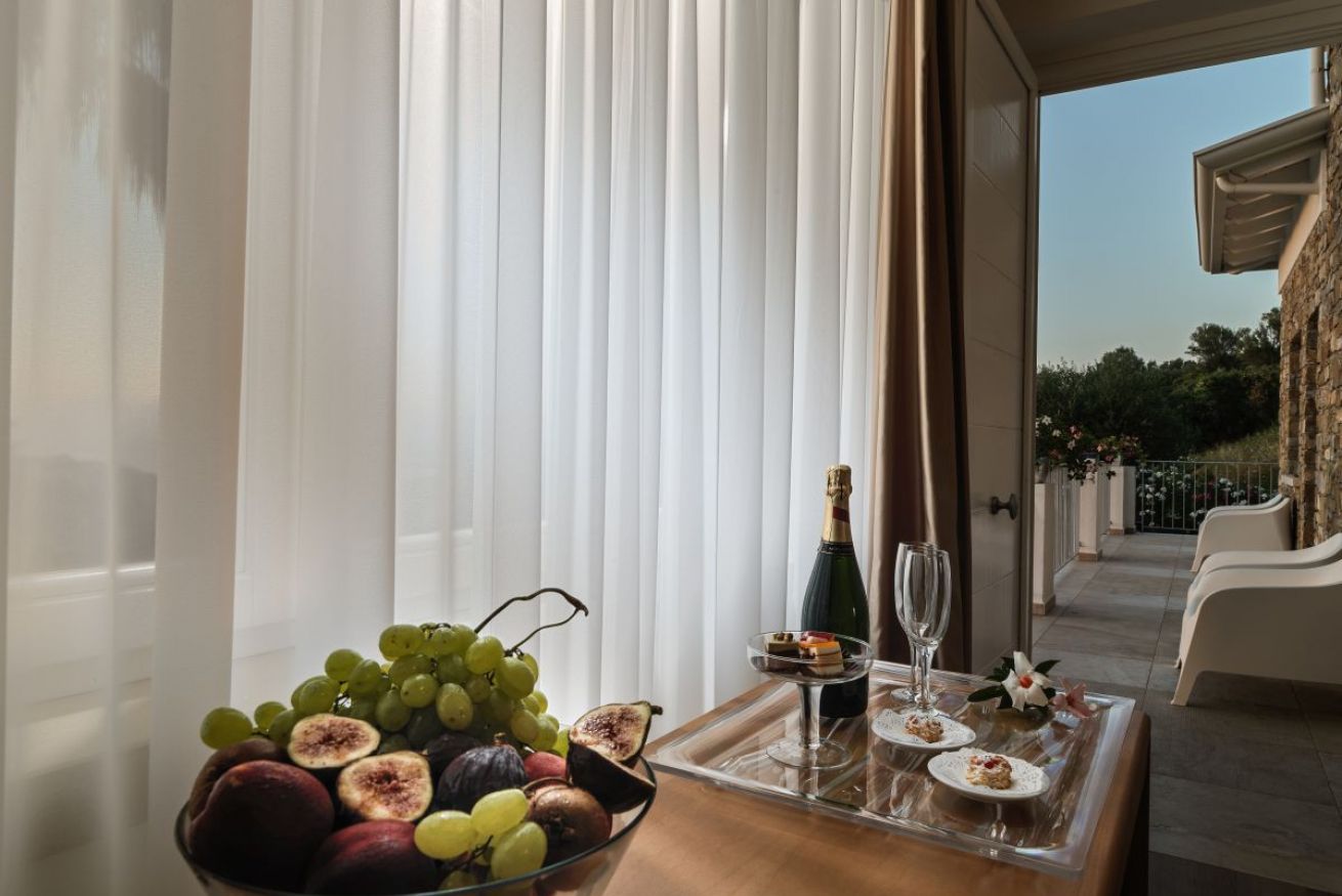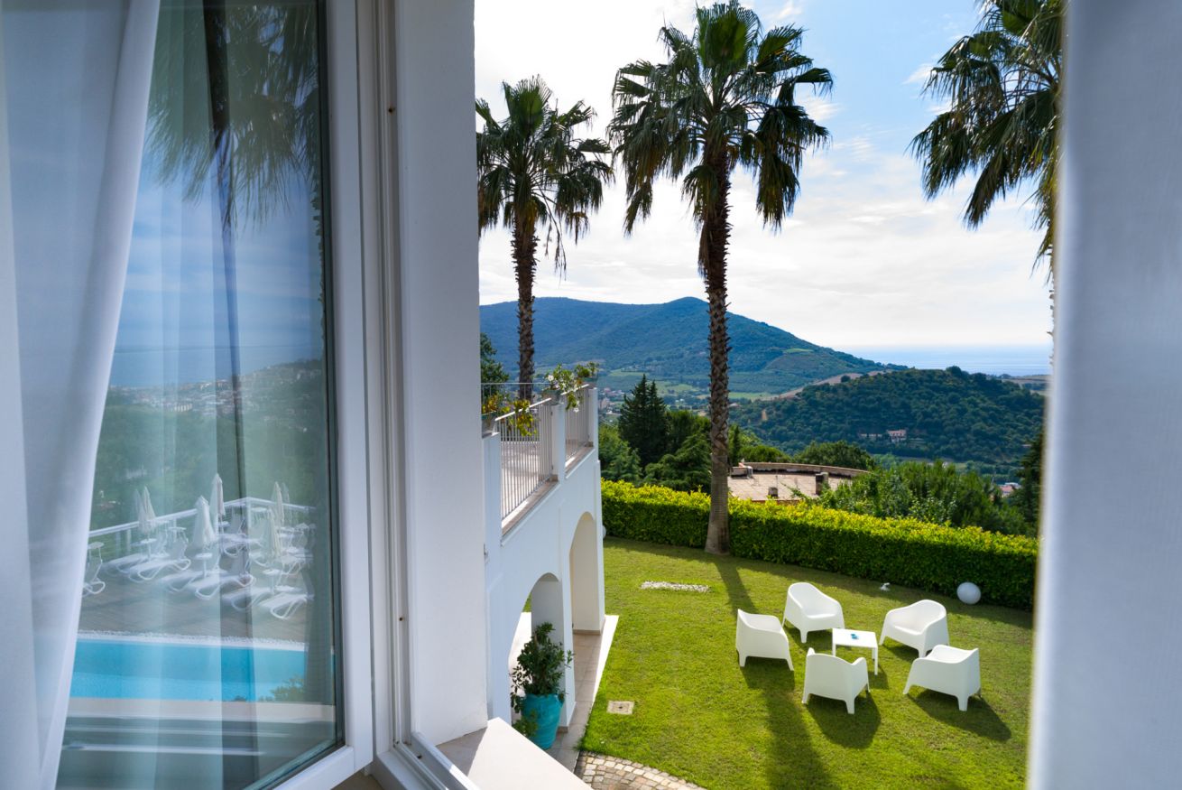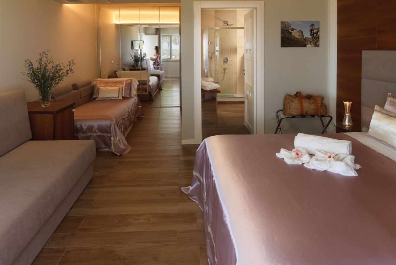 La camera è ubicata al piano terra o al 1°piano, misura circa 30 mq, è una doppia o matrimoniale con bagno privato e doccia. La camera può essere utilizzata come tripla con la configurazione matrimoniale più 1 letto singolo, oppure 3 letti singoli e gode della vista mare, giardino e piscina.