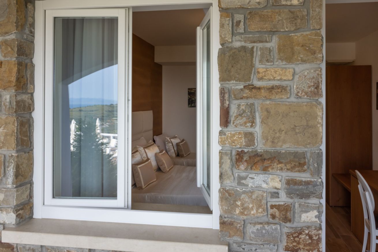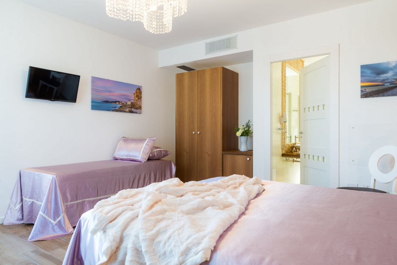La camera è ubicata al 1°piano, misura 36 mq, è una doppia o matrimoniale con bagno privato e doccia. La camera può essere utilizzata come tripla con la configurazione matrimoniale più 1 letto singolo, oppure quadrupla con letto matrimoniale e 2 letti singoli e gode della vista mare, giardino e piscina.